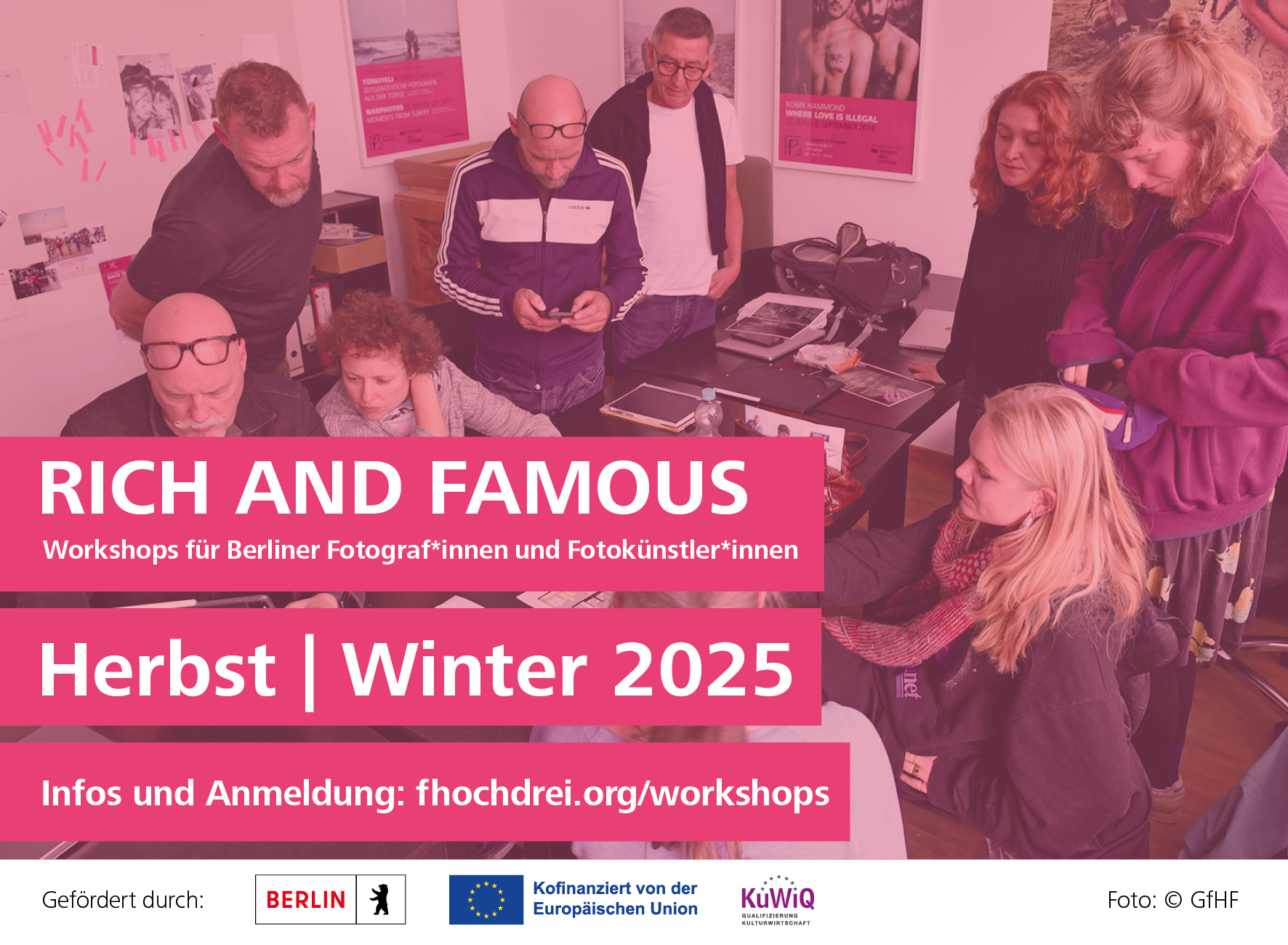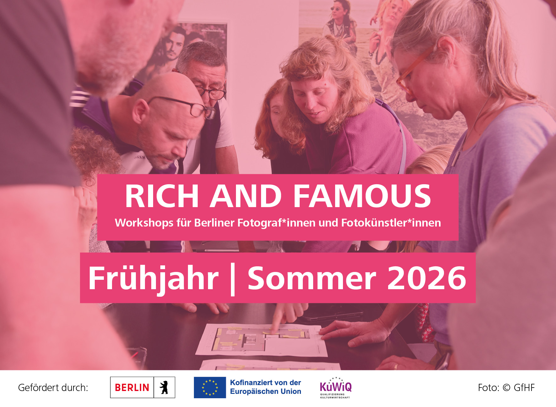 Unsere Angebote für professionelle Fotograf*innen, Fotokünstler*innen und Liebhaber*innen des Mediums reichen von mehrmonatigen Masterclasses zur Realisierung eines Foto-Projektes bis zu eintätigen Workshops, die sich mit praktischen Themen wie Budgetierung und SEO-Optimierung befassen. Hier findet jede*r etwas passendes!